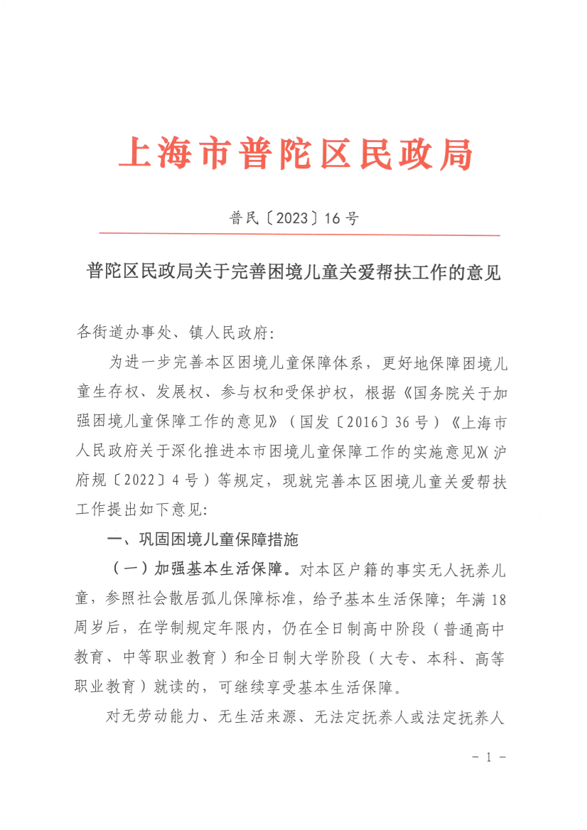 普陀区民政局关于完善困境儿童关爱帮扶工作的意见