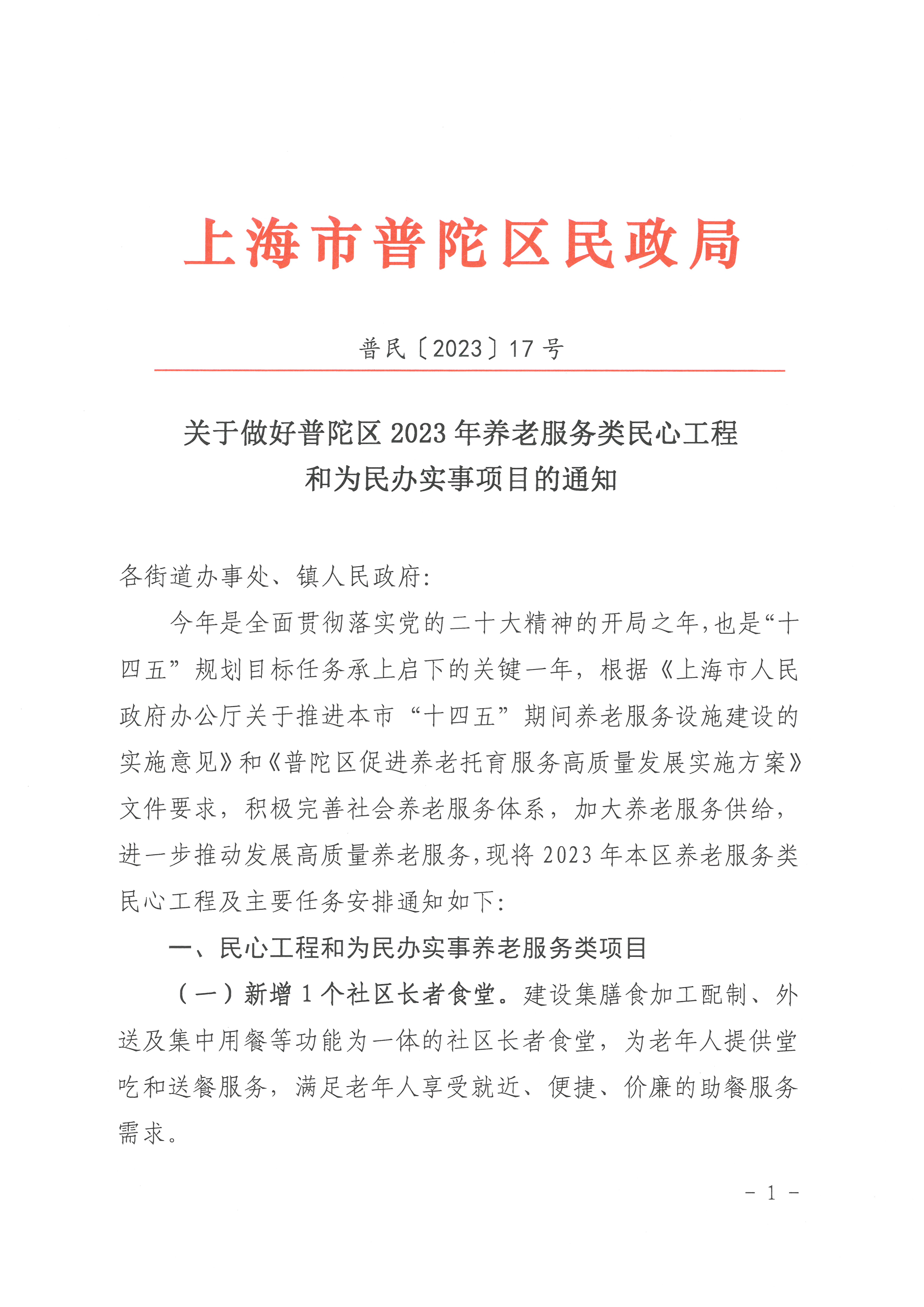 关于做好普陀区2023年养老服务类民心工程和为民办实事项目的通知