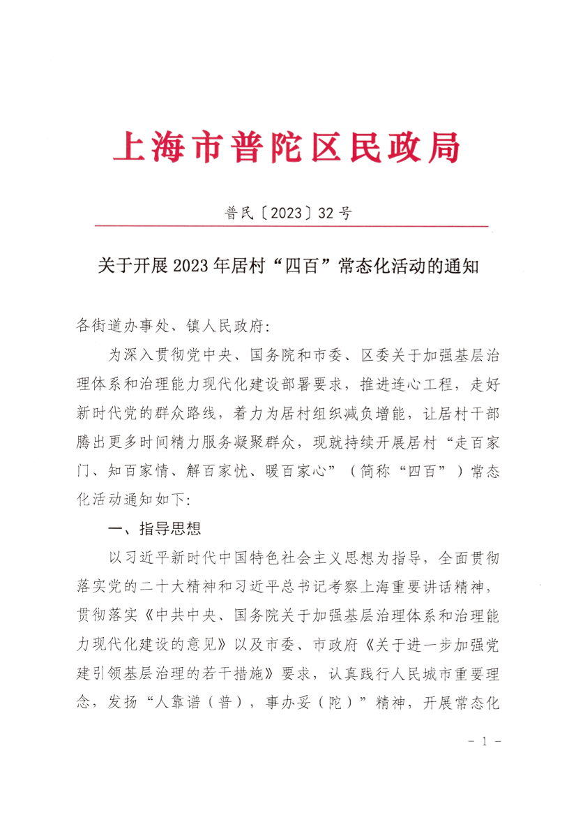 为深入贯彻党中央、国务院和市委、区委关于加强基层治理体系和治理能力现代化建设部署要求,推进连心工程,走好新时代党的群众路线,着力为居村组织减负增能,让居村干部腾出更多时间精力服务凝聚群众,现就持续开展居村“走百家门、知百家情、解百家忧、暖百家心”(简称“四百”)常态化活动通知如下: