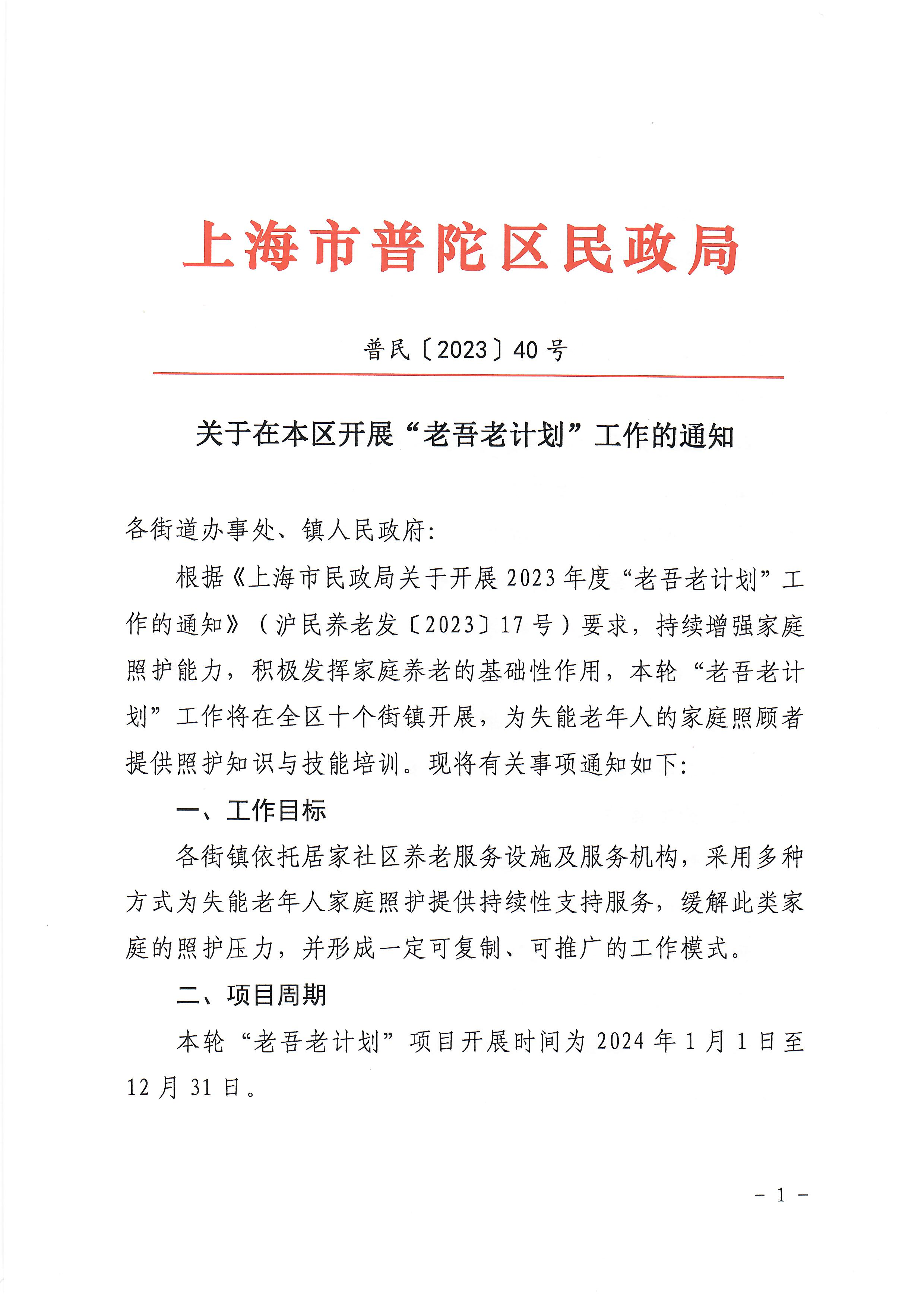 关于在本区开展“老吾老计划”工作的通知