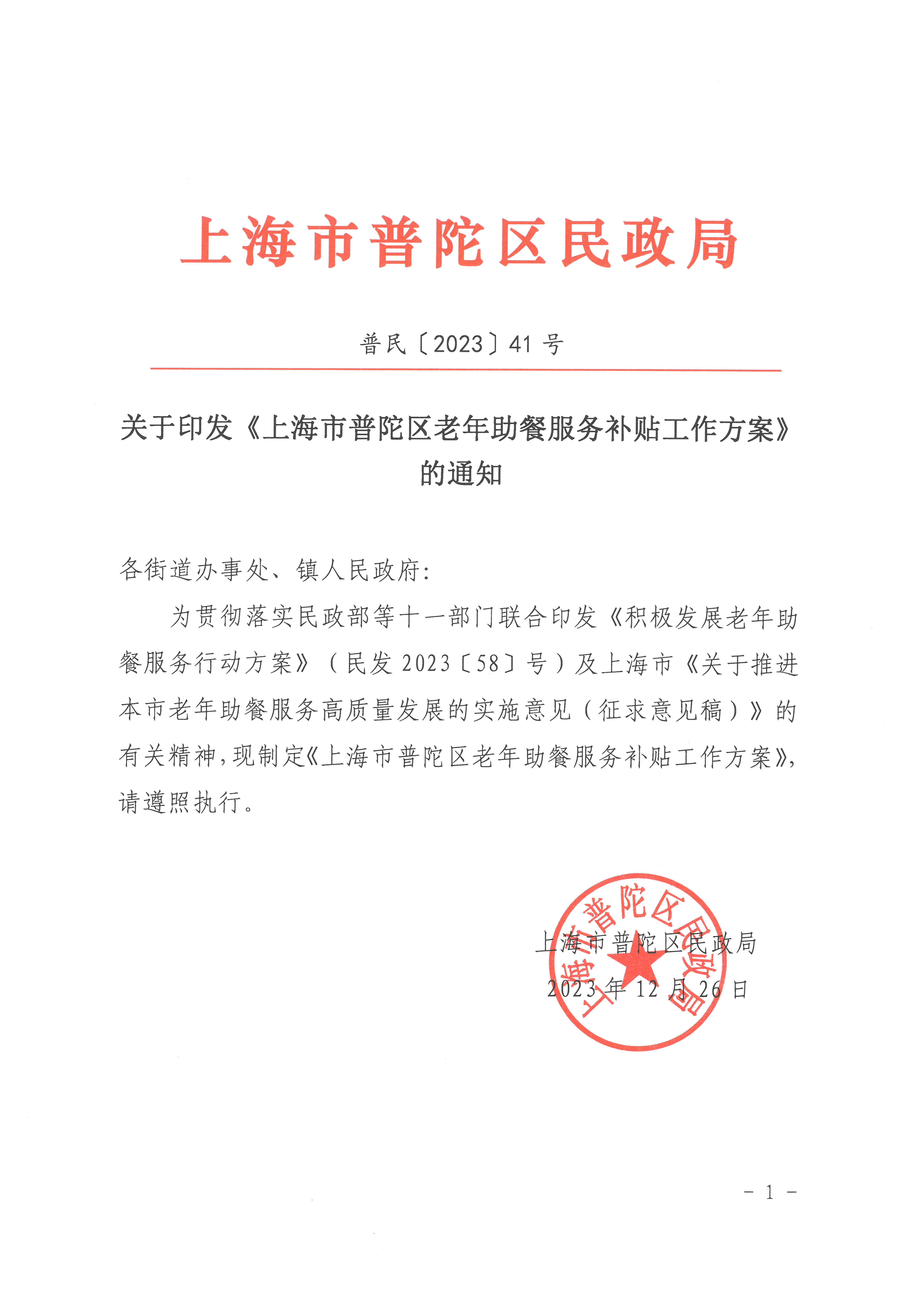 关于印发《上海市普陀区老年助餐服务补贴工作方案》的通知