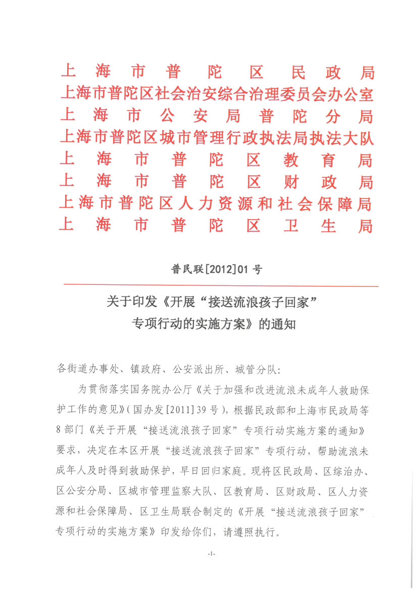 为贯彻落实国务院办公厅《关于加强和改进流浪未成年人救助保护工作的意见》(国办发[2011]39号,以下简称《意见》),根据市民政局等8部门《开展“接送流浪孩子回家”专项行动实施方案的通知》(沪民福发[2012]8号,以下简称《通知》)要求,决定在本区开展以“保护儿童,告别流浪”为主题的“接送流浪孩子回家”专项行动。具体实施方案如下: