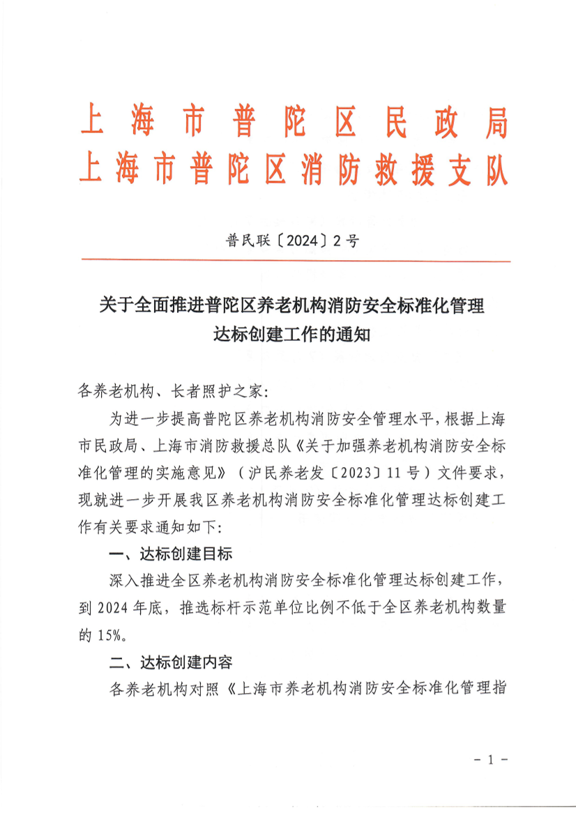 为进一步提高普陀区养老机构消防安全管理水平,根据上海市民政局、上海市消防救援总队《关于加强养老机构消防安全标准化管理的实施意见》(沪民养老发〔2023〕11号)文件要求,现就进一步开展我区养老机构消防安全标准化管理达标创建工作有关要求通知如下: