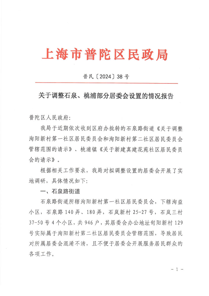 关于调整石泉、桃浦部分居委会设置的情况报告