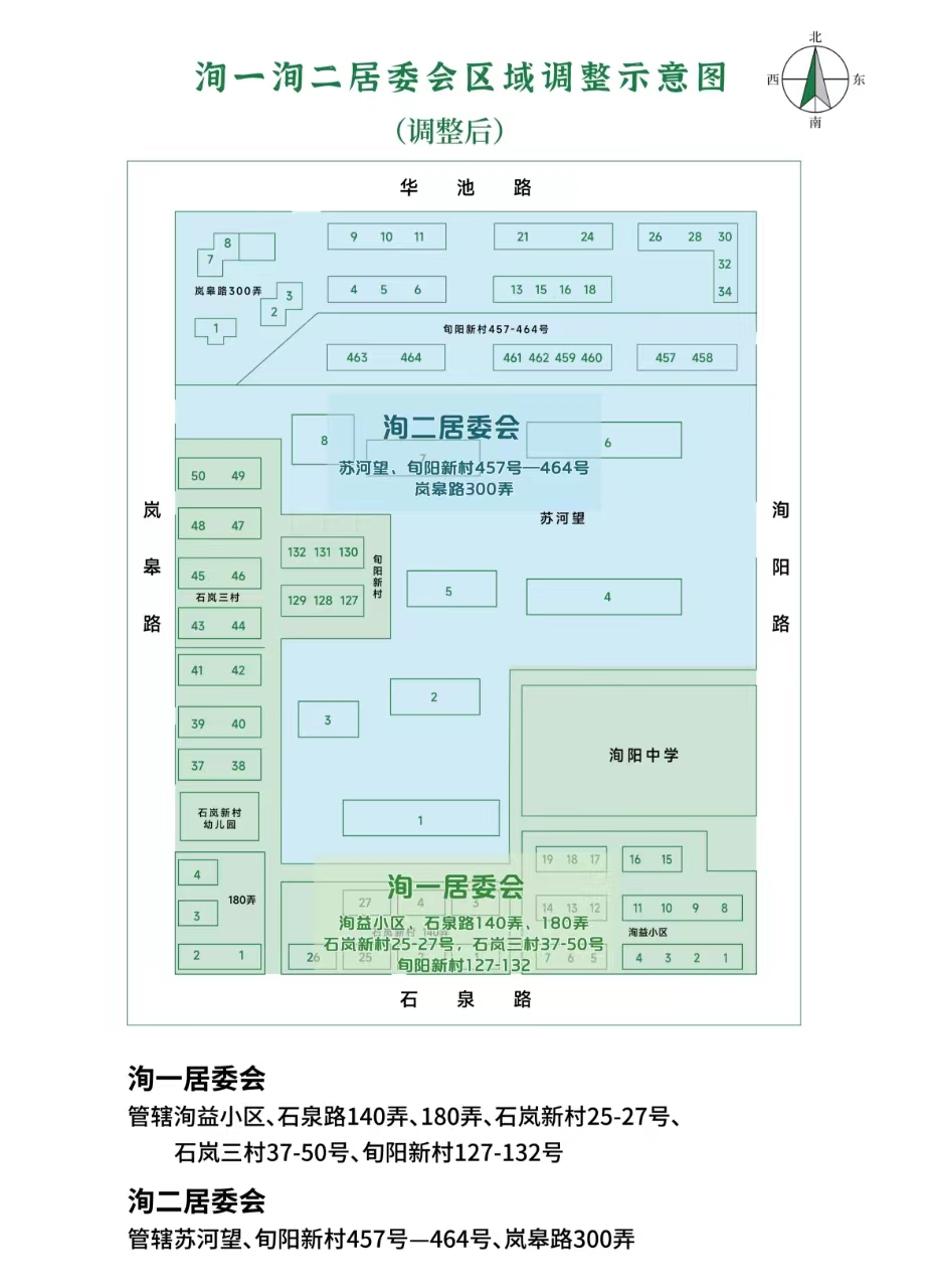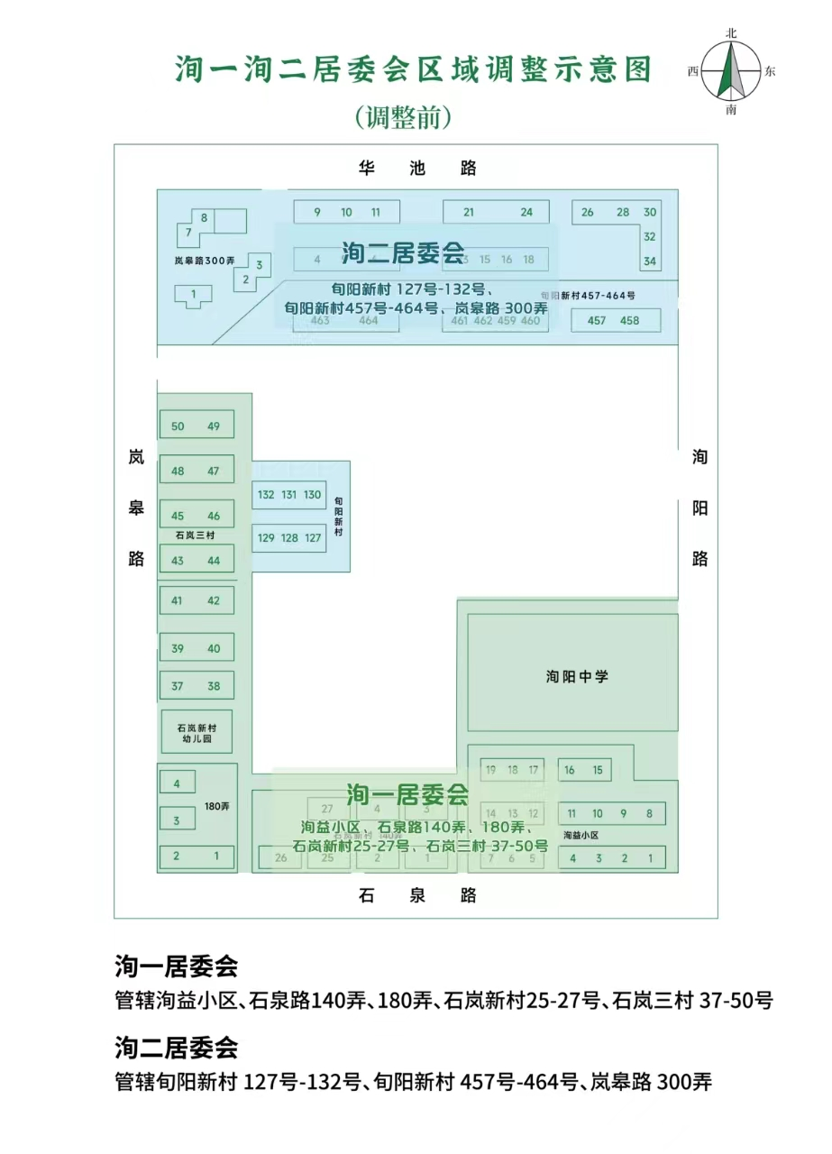 1、洵阳新村第一社区居民委员会:自洵阳新村第二社区居民委员会划入旬阳新村127-132号小区,调整后管辖旬阳新村127号—132号,洵益小区,石泉路140弄、180弄,石岚新村25-27号,石岚三村37-50号5个小区,共1070户。居委会办公用房位于旬阳新村129号101室(保持原址不变),面积150平方米;活动用房位于为旬阳新村129号102室(保持原址不变),面积102平方米。