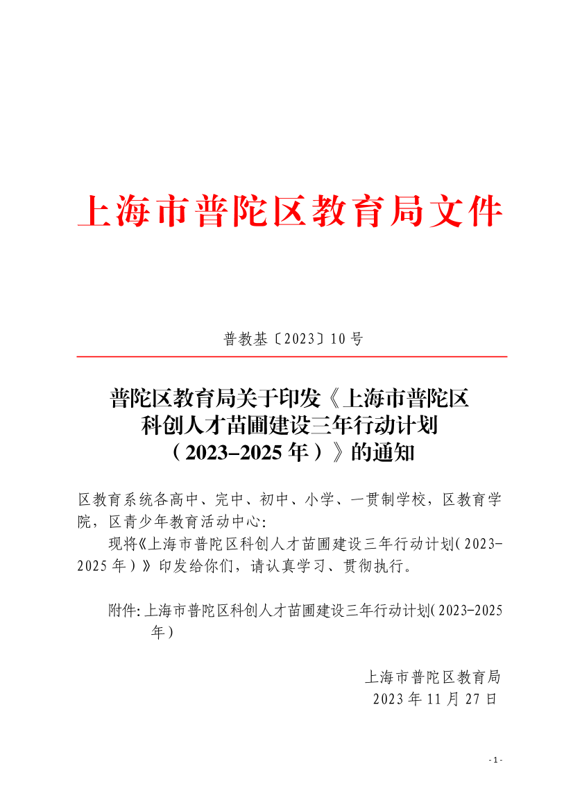 关于印发《上海市普陀区科创人才苗圃建设三年行动计划(2023-2025年)》的通知