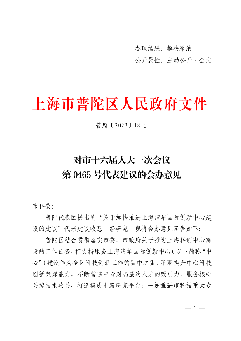 普陀代表团提出的“关于加快推进上海清华国际创新中心建设的建议”代表建议收悉,经研究,现将会办意见函告如下: