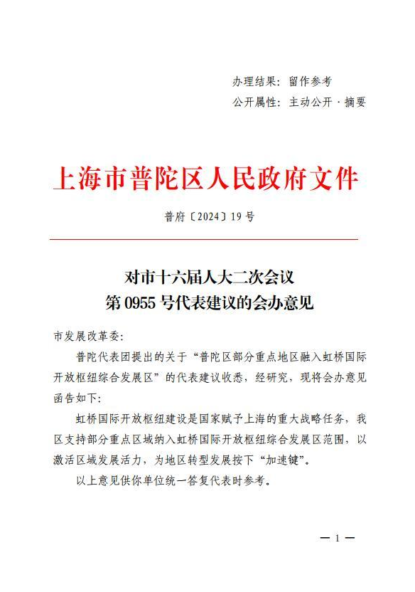 普陀代表团提出的关于“普陀区部分重点地区融入虹桥国际开放枢纽综合发展区”的代表建议收悉,经研究,现将会办意见函告如下:
