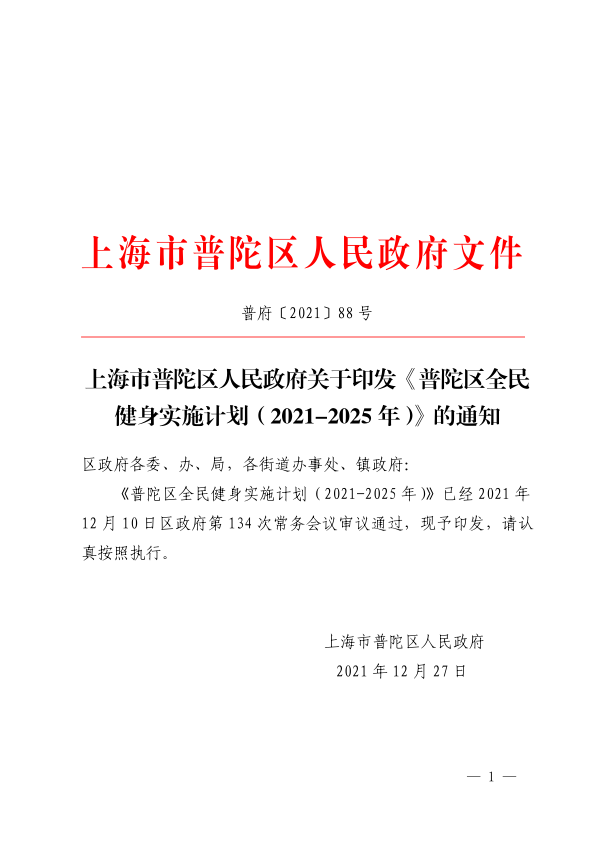 上海市普陀区人民政府关于印发《普陀区全民健身实施计划(2021-2025年)》的通知