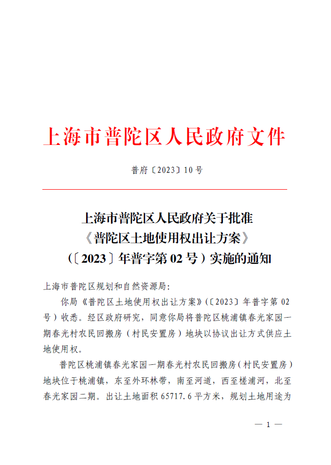 你局《普陀区土地使用权出让方案》(〔2023〕年普字第02号)收悉。经区政府研究,同意你局将普陀区桃浦镇春光家园一期春光村农民回搬房(村民安置房)地块以协议出让方式供应土地使用权。