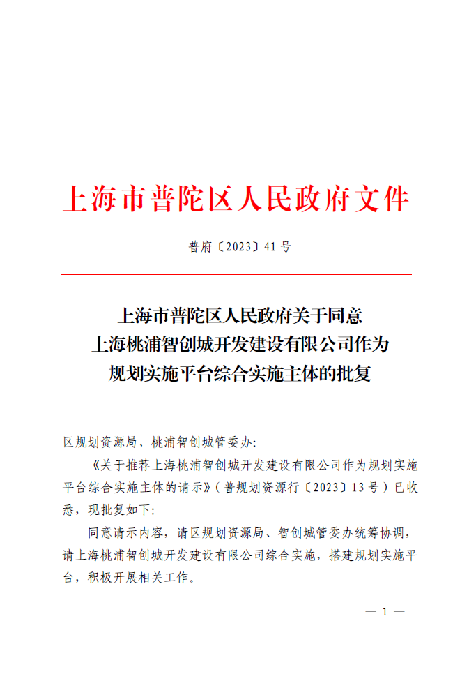 《关于推荐上海桃浦智创城开发建设有限公司作为规划实施平台综合实施主体的请示》(普规划资源行〔2023〕13号)已收悉,现批复如下: