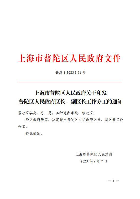 上海市普陀区人民政府关于印发普陀区人民政府区长、副区长工作分工的通知