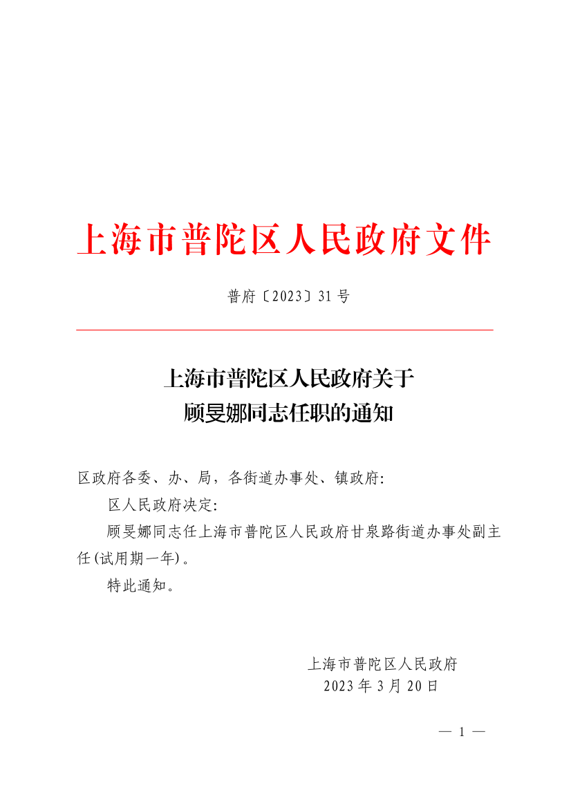 上海市普陀区人民政府关于顾旻娜同志任职的通知