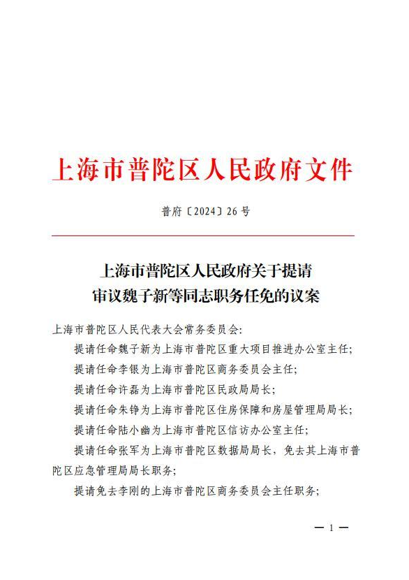 提请任命张军为上海市普陀区数据局局长,免去其上海市普陀区应急管理局局长职务;