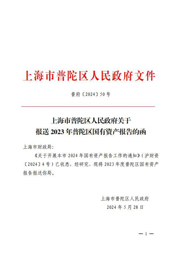 上海市普陀区人民政府关于报送2023年普陀区国有资产报告的函