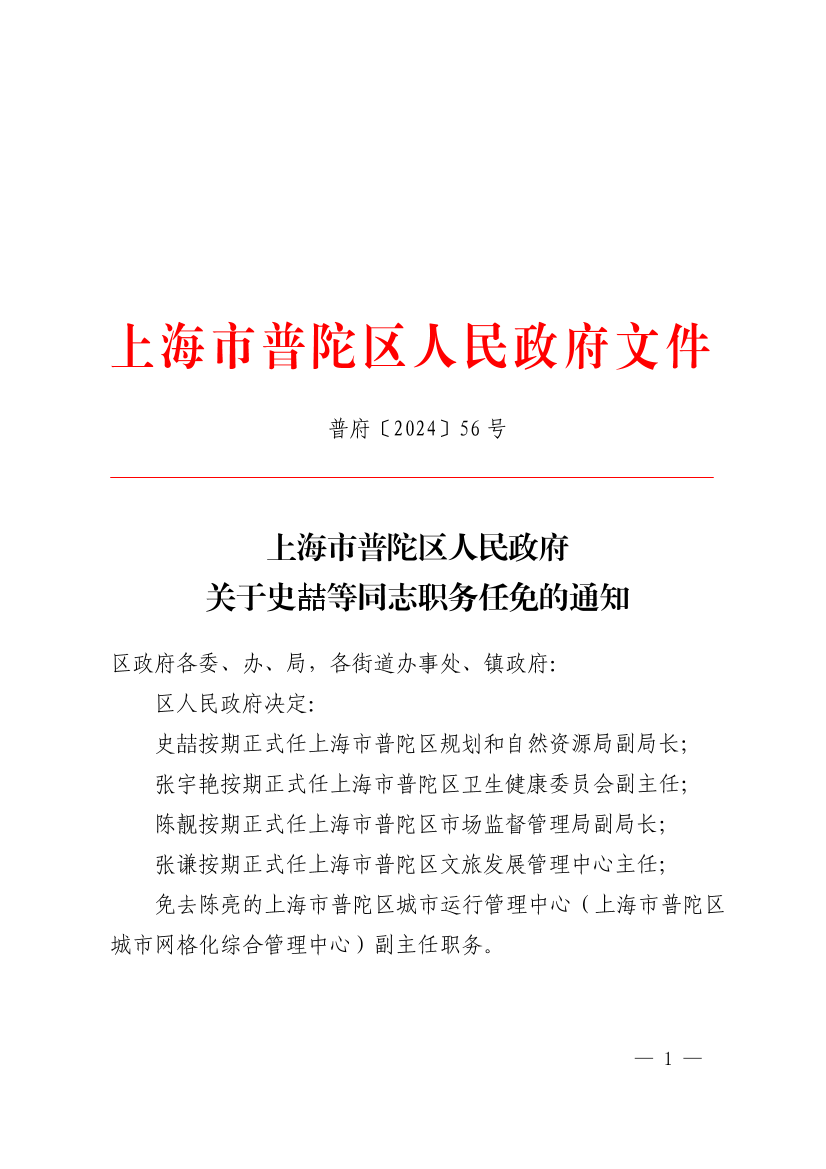 上海市普陀区人民政府关于史喆等同志职务任免的通知