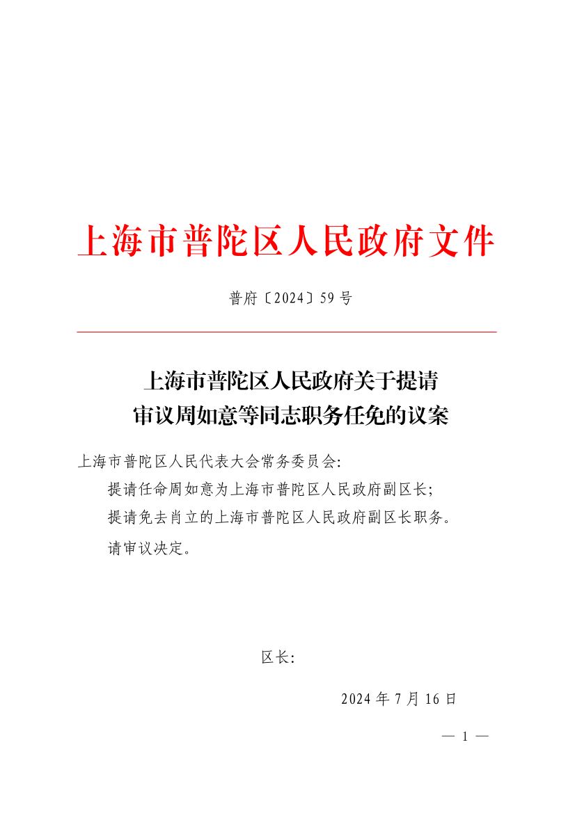 上海市普陀区人民政府关于提请审议周如意等同志职务任免的议案