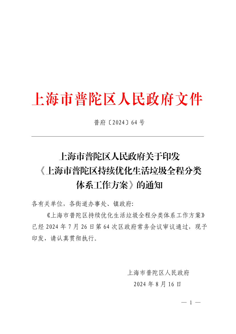 上海市普陀区人民政府关于印发《上海市普陀区持续优化生活垃圾全程分类体系工作方案》的通知