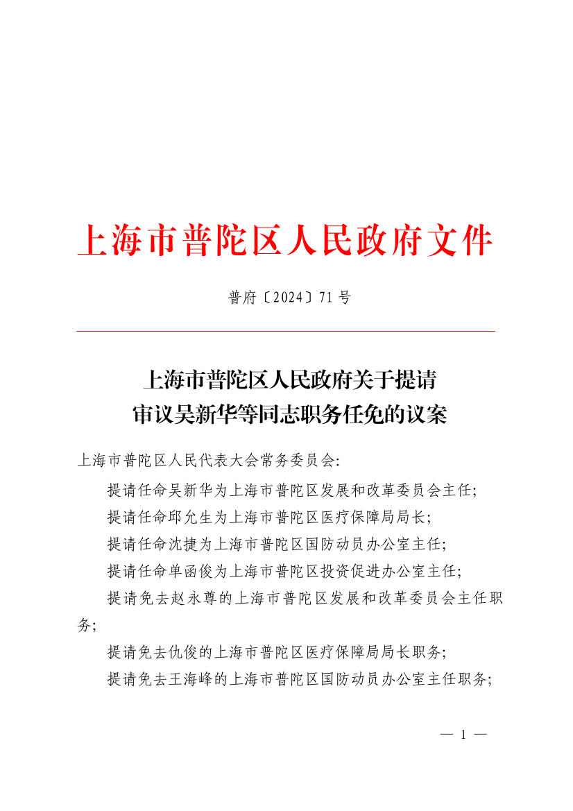 提请任命吴新华为上海市普陀区发展和改革委员会主任;