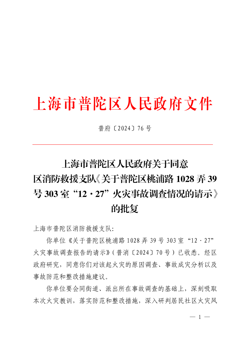 你单位《关于普陀区桃浦路1028弄39号303室“12·27”火灾事故调查报告的请示》(普消〔2024〕70号)已收悉。经区政府研究,同意你们对该起火灾的原因调查、事故成灾分析以及事故防范和整改措施建议。