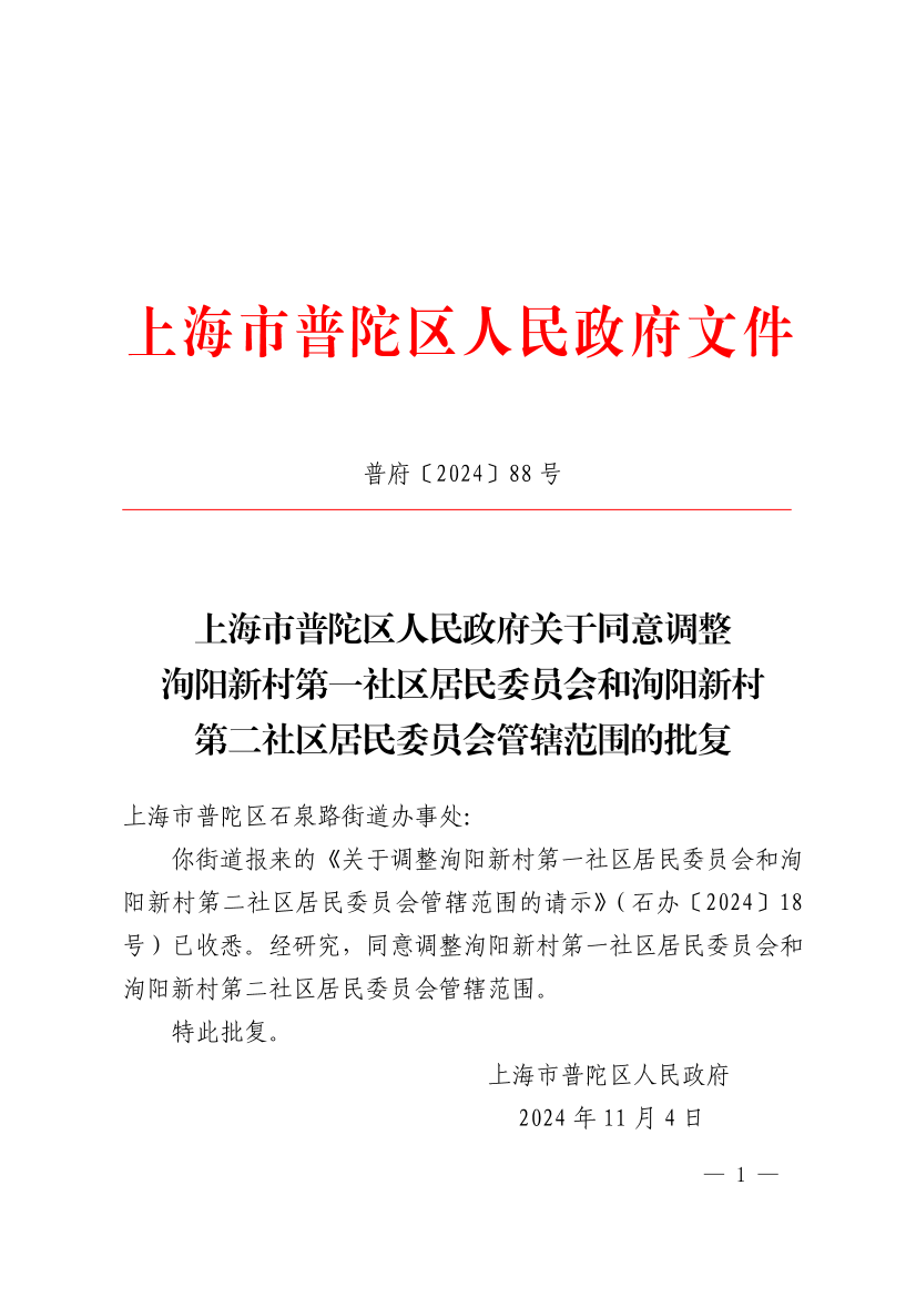 你街道报来的《关于调整洵阳新村第一社区居民委员会和洵阳新村第二社区居民委员会管辖范围的请示》(石办〔2024〕18号)已收悉。经研究,同意调整洵阳新村第一社区居民委员会和洵阳新村第二社区居民委员会管辖范围。