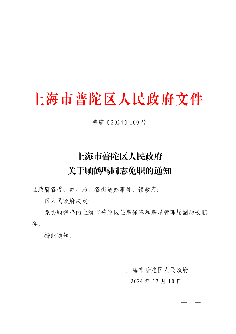 免去顾鹤鸣的上海市普陀区住房保障和房屋管理局副局长职务。