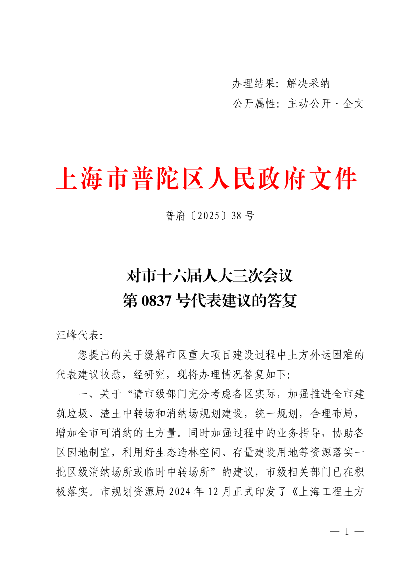 一、关于“请市级部门充分考虑各区实际,加强推进全市建筑垃圾、渣土中转场和消纳场规划建设,统一规划,合理布局,增加全市可消纳的土方量。同时加强过程中的业务指导,协助各区因地制宜,利用好生态造林空间、存量建设用地等资源落实一批区级消纳场所或临时中转场所”的建议,市级相关部门已在积极落实。市规划资源局2024年12月正式印发了《上海工程土方综合利用空间图则指引(近期)》《上海工程土方综合利用空间规划指引(2024-2035)》《关于加强本市工程土方综合利用的规划资源管理指导意见》,从规划层面明确了近期104处(消纳潜力约1.27亿吨)工程土方综合利用潜力空间,明确了全市“一带六环、三圈十三射、多廊多点”的土方综合利用空间总体格局;市绿化市容局会同市重大办(住建委)、市规划资源局等相关部门,组建市级土方消纳应急工作专班,排摸全市出土需求,推进9处市级消纳场所建设,初步制定了2025年土方消纳计划。2月12日,小宏副市长、为人副秘书长召开建筑工程土方消纳调度专题会议,明确土方消纳保障原则,中心城区的市级重大工程原则上由市级消纳场所保障,非市重大工程土方的市级保障比例约为80%,其余20%由区内通过源头减量、土地整理等途径自行消纳保障。