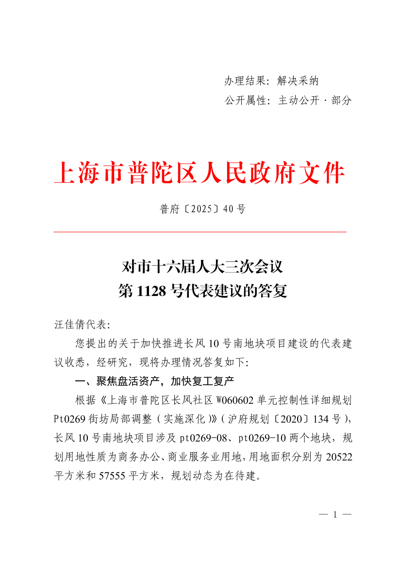您提出的关于加快推进长风10号南地块项目建设的代表建议收悉,经研究,现将办理情况答复如下: