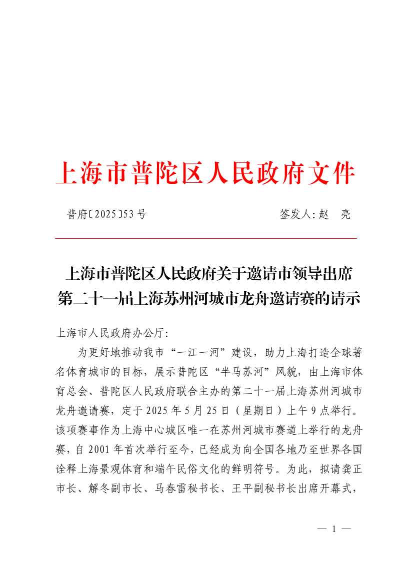 为更好地推动我市“一江一河”建设,助力上海打造全球著名体育城市的目标,展示普陀区“半马苏河”风貌,由上海市体育总会、普陀区人民政府联合主办的第二十一届上海苏州河城市龙舟邀请赛,定于2025年5月25日(星期日)上午9点举行。该项赛事作为上海中心城区唯一在苏州河城市赛道上举行的龙舟赛,自2001年首次举行至今,已经成为向全国各地乃至世界各国诠释上海景观体育和端午民俗文化的鲜明符号。为此,拟请龚正市长、解冬副市长、马春雷秘书长、王平副秘书长出席开幕式,并请龚正市长宣布开幕,请解冬副市长、马春雷秘书长、王平副秘书长共同点睛。