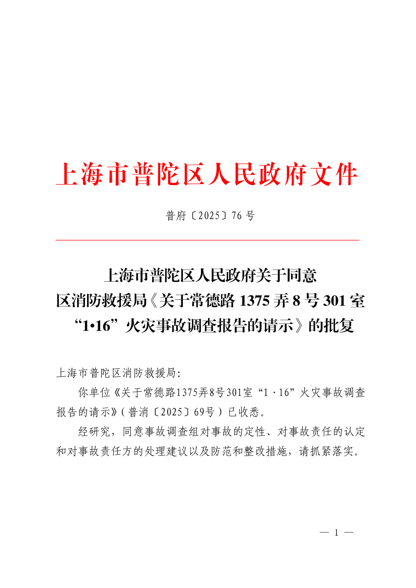 你单位《关于常德路1375弄8号301室“1·16”火灾事故调查报告的请示》(普消〔2025〕69号)已收悉。