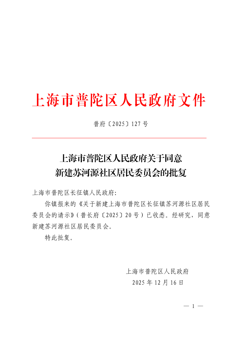 你镇报来的《关于新建上海市普陀区长征镇苏河源社区居民委员会的请示》(普长府〔2025〕20号)已收悉。经研究,同意新建苏河源社区居民委员会。