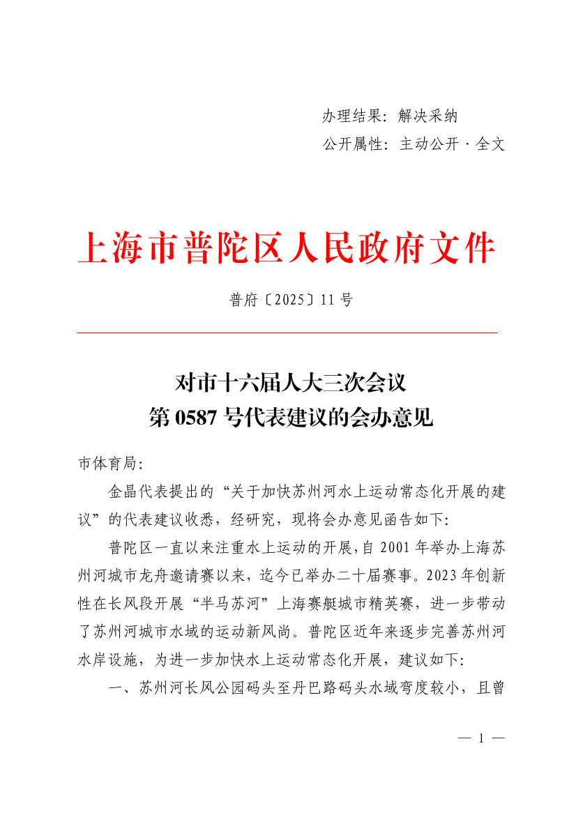 金晶代表提出的“关于加快苏州河水上运动常态化开展的建议”的代表建议收悉,经研究,现将会办意见函告如下: