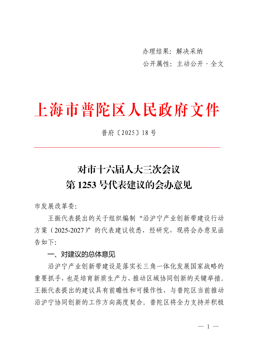 沿沪宁产业创新带建设是落实长三角一体化发展国家战略的重要抓手,也是培育新质生产力、推动区域协同创新的关键举措。王振代表提出的建议具有前瞻性和可操作性,与普陀区当前推动沿沪宁协同创新的工作方向高度契合。普陀区将全力支持并积极参与行动方案的联合编制工作,推动方案尽快落地实施。