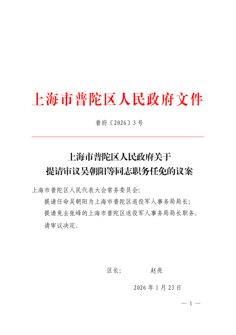 提请任命吴朝阳为上海市普陀区退役军人事务局局长;