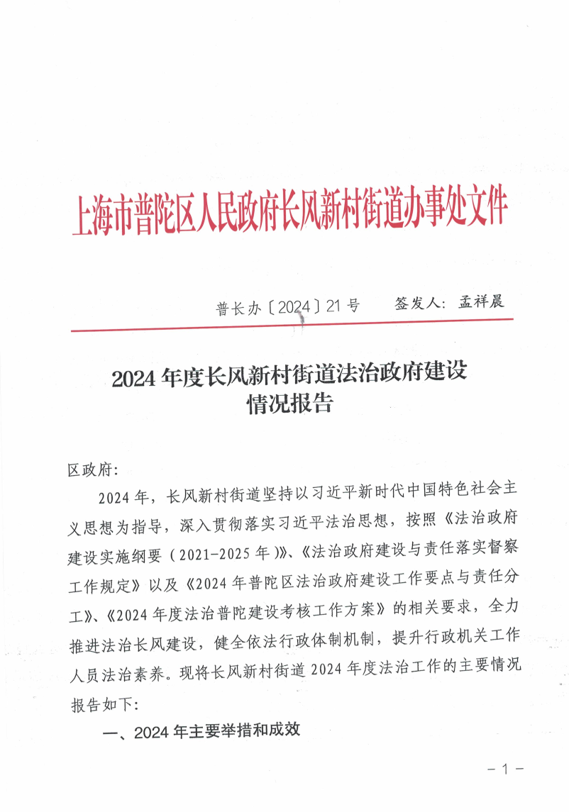 2024年,长风新村街道坚持以习近平新时代中国特色社会主义思想为指导,深入贯彻落实习近平法治思想,按照《法治政府建设实施纲要(2021-2025年)》、《法治政府建设与责任落实督察工作规定》以及《2024年普陀区法治政府建设工作要点与责任分工》、《2024年度法治普陀建设考核工作方案》的相关要求,全力推进法治长风建设,健全依法行政体制机制,提升行政机关工作人员法治素养。现将长风新村街道2024年度法治工作的主要情况报告如下: