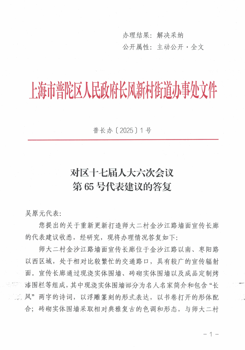 您提出的关于重新更新打造师大二村金沙江路墙面宣传长廊的代表建议收悉,经研究,现将办理情况答复如下: