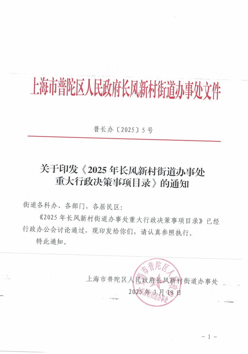 关于印发《2025年长风新村街道办事处重大行政决策事项目录》的通知