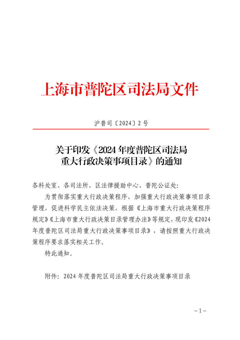 关于印发《2024年度普陀区司法局重大行政决策事项目录》的通知