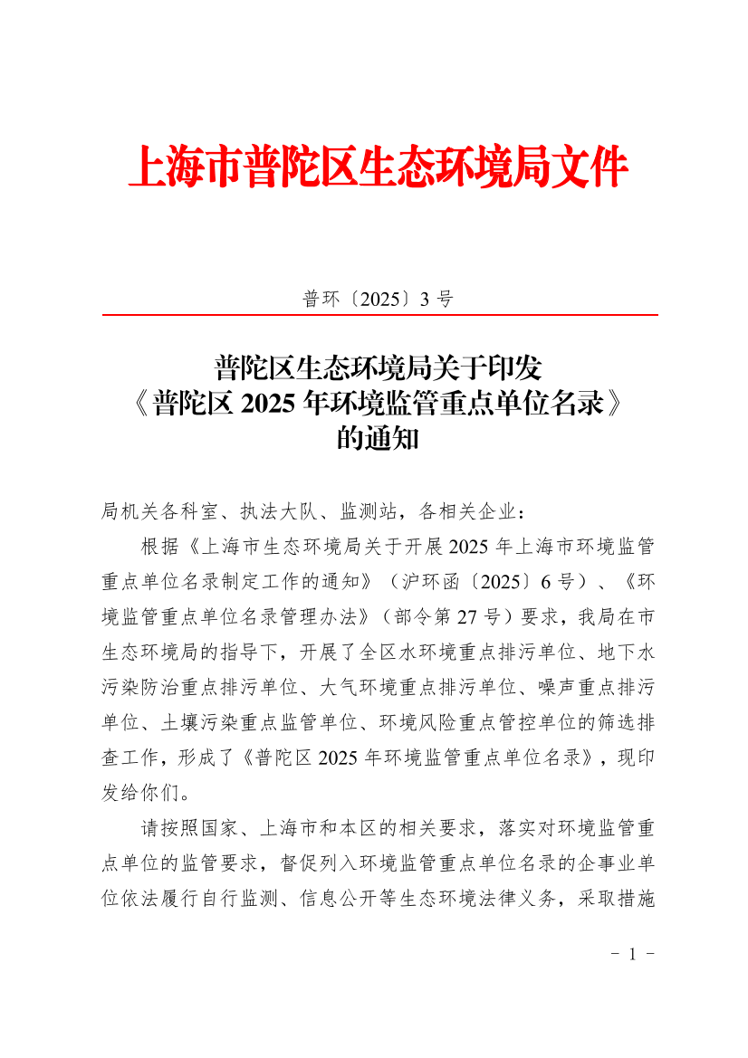 普陀区生态环境局关于印发《普陀区2025年环境监管重点单位名录》的通知
