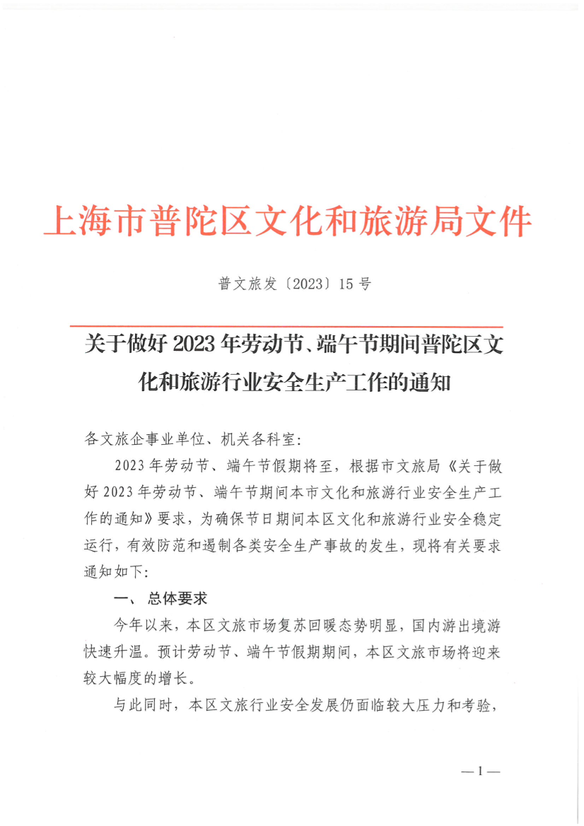 关于做好2023年劳动节、端午节期间普陀区文化和旅游行业安全生产工作的通知