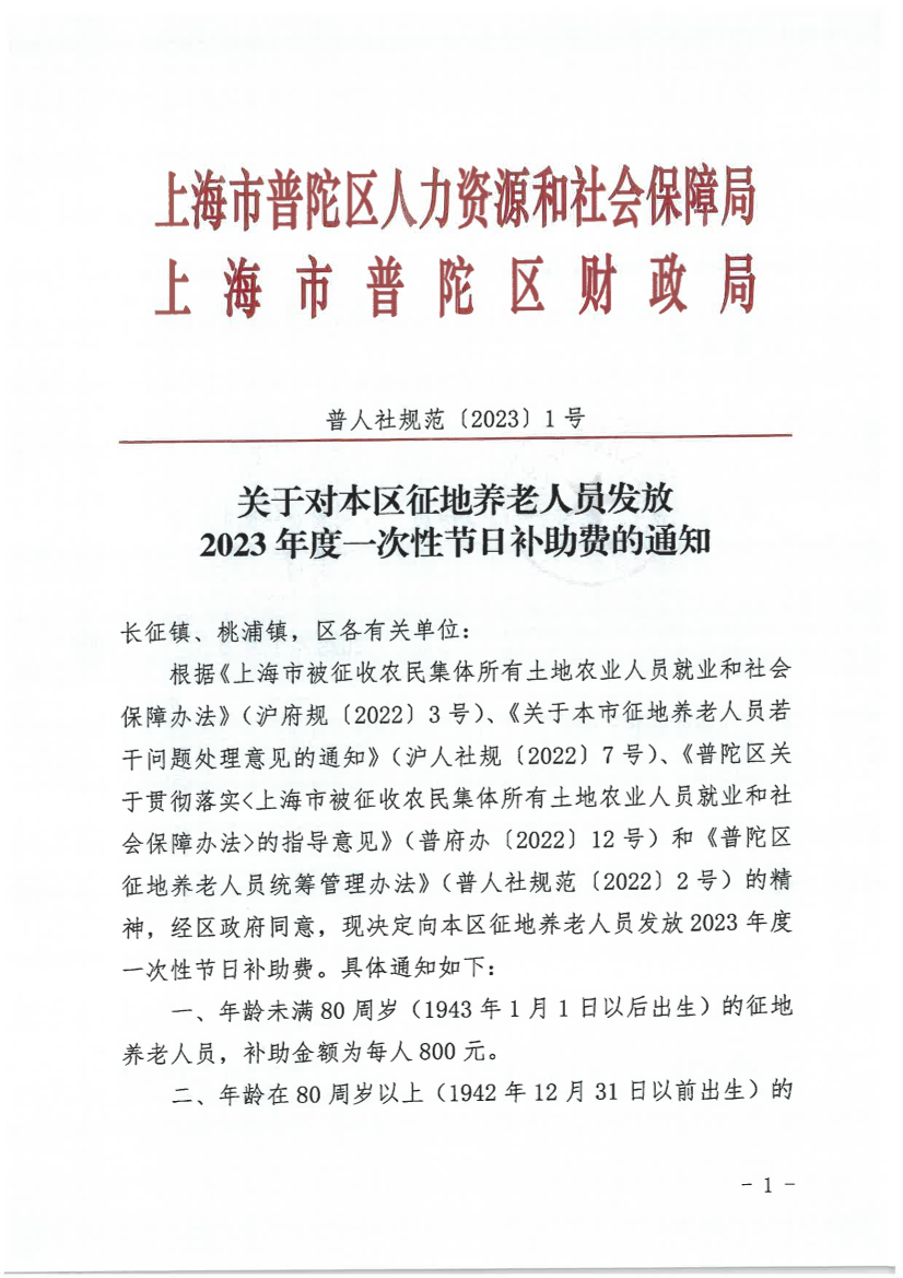 根据《上海市被征收农民集体所有土地农业人员就业和社会保障办法》(沪府规〔2022〕3号)、《关于本市征地养老人员若干问题处理意见的通知》(沪人社规〔2022〕7号)、《普陀区关于贯彻落实<上海市被征收农民集体所有土地农业人员就业和社会保障办法>的指导意见》(普府办〔2022〕12号)和《普陀区征地养老人员统筹管理办法》(普人社规范〔2022〕2号)的精神,经区政府同意,现决定向本区征地养老人员发放2023年度一次性节日补助费。具体通知如下: