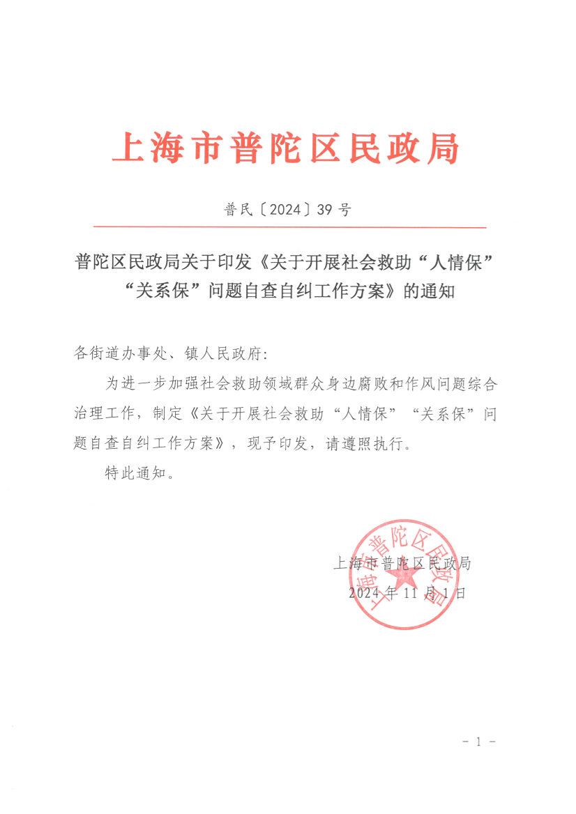 普陀区民政局关于印发《关于开展社会救助“人情保”“关系保”问题自查自纠工作方案》的通知