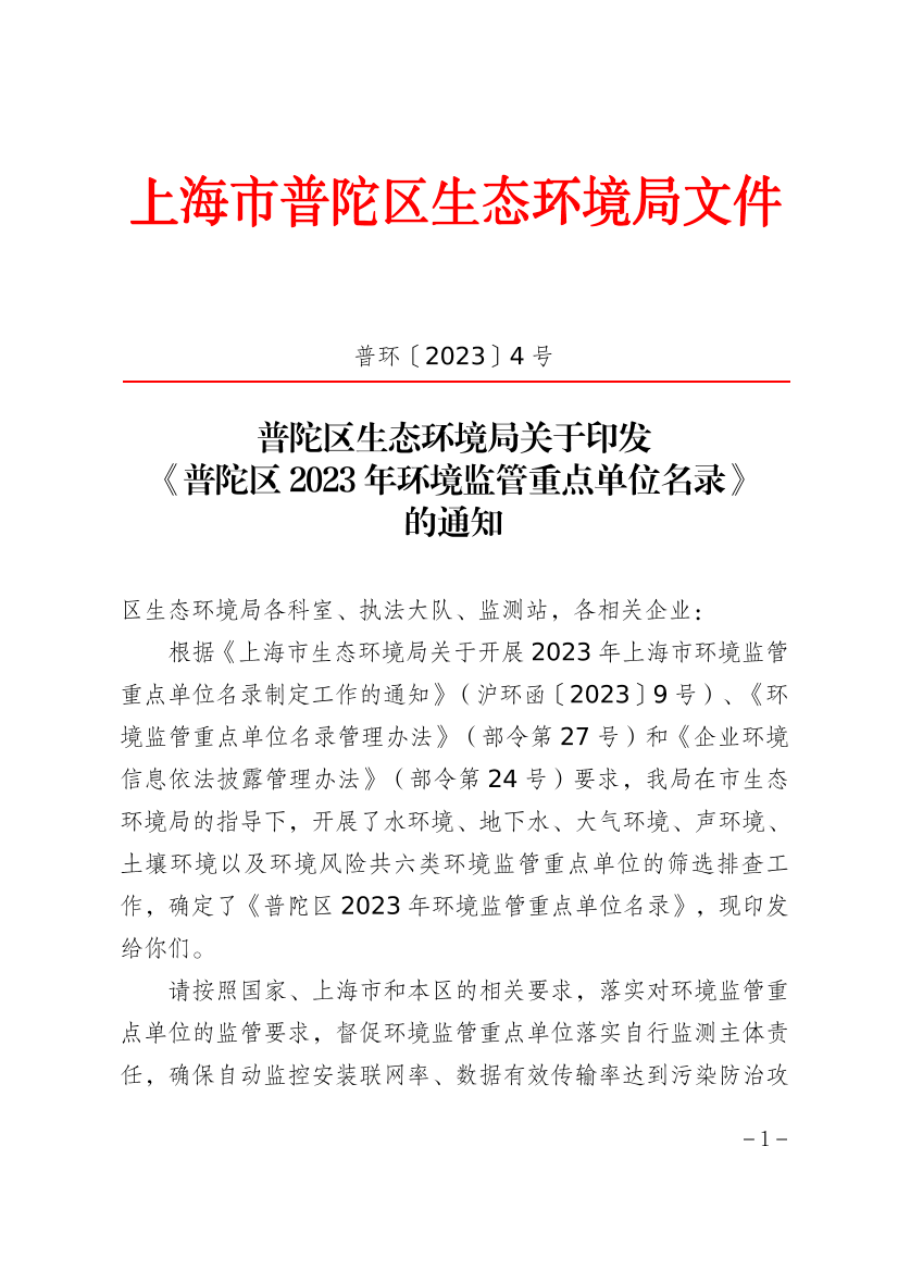 普陀区生态环境局关于印发《普陀区2023年环境监管重点单位名录》的通知