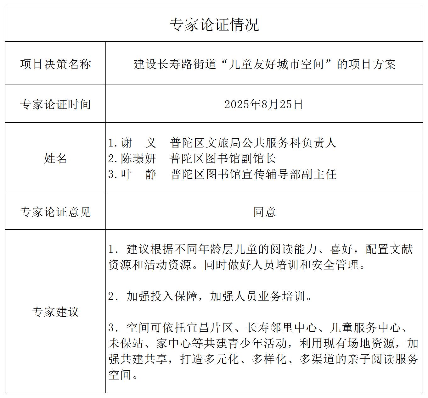 2025年8月22日,邀请普陀区文旅局公共服务科负责人谢义、普陀区图书馆副馆长陈璟妍、普陀区图书馆宣传辅导部副主任叶静等专家进行书面论证,8月25日,专家意见反馈情况(附后)。