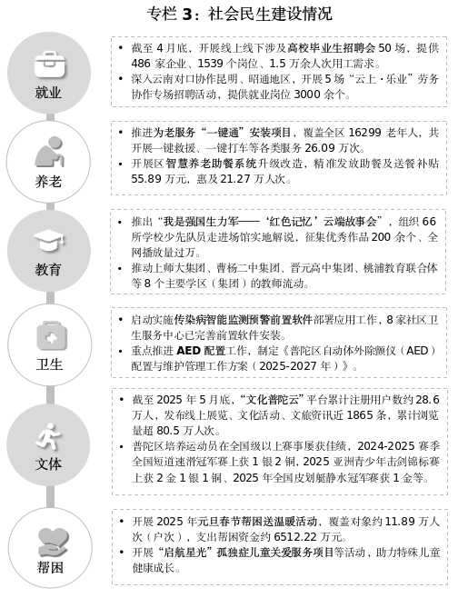就业帮扶提质增效。开展“政策找人、政策找企”专项行动,截至4月底,举办线上线下招聘会128场,提供3万余人次用工需求。强化稳就业政策支持,发放各类就业创业扶持补贴2874.94万元。推进毕业生就业服务专项行动,举办2025年普陀区高校毕业生就业服务“扬帆”专项行动暨专场招聘会。持续推进“15分钟就业服务圈”社区就业服务站点建设,完善“1+10+N”的就业公共服务网络。