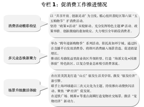 提升增长动能驱动层级。消费方面,举办上海之夏系列特色活动,强化商旅文体联动,联手重点商圈和重点商业企业,着力打造普陀消费品牌。持续发挥汽车消费补贴政策作用,用好资源腾笼换鸟,稳住汽车消费基本盘。投资方面,持续开展全区纳统项目固定资产投资和建安投资的排摸和推进工作,加快2025年预备项目前期研究论证和审批,做好专项债券项目情况跟踪和上报。外贸方面,打好稳外贸政策组合拳,根据企业特点和个性化需求送政策上门,全力实现进出口促稳提质目标任务。推动企业积极参与进博会、广交会、数交会等活动,有针对性地引导企业拓展各类新兴市场及“一带一路”沿线国家市场,积极参与国际合作。