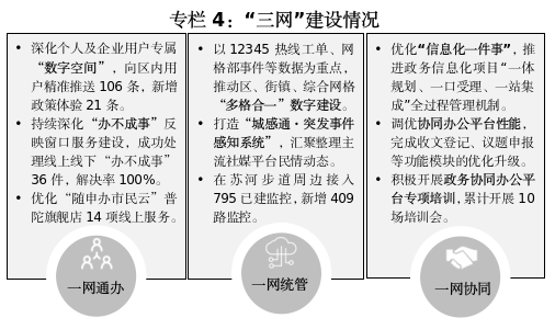 数智赋能城区治理。从城市治理根节问题入手,推动“三张网”加速融合,推动业务流程隐形化、服务触达精准化。整合市民热线、网格上报、智能发现事件等城市运行数据,探索建立统一事件分类标准及多维度标签体系,实现跨系统事件同步及动态管理。做好民意数据挖掘及诉求信息深度剖析,发挥12345热线预警预判作用,有效减少各类矛盾。