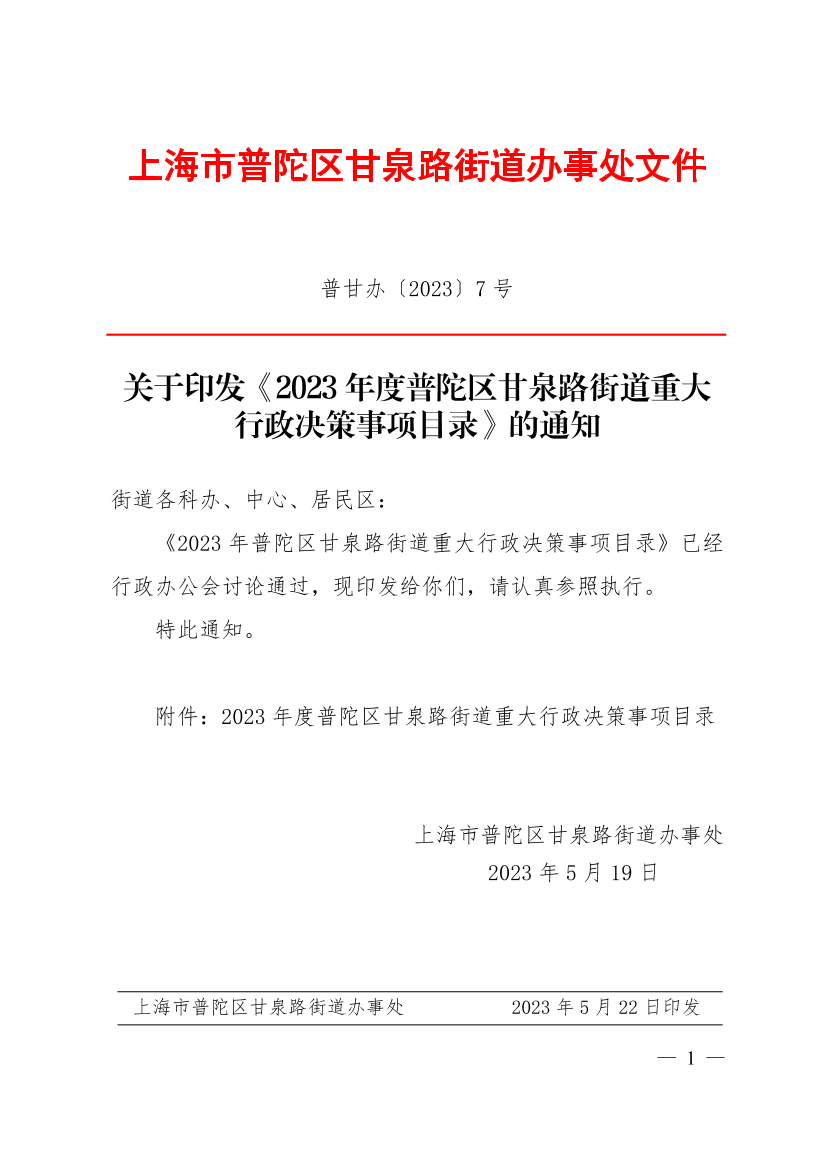 关于印发《2023年度普陀区甘泉路街道重大行政决策事项目录》的通知