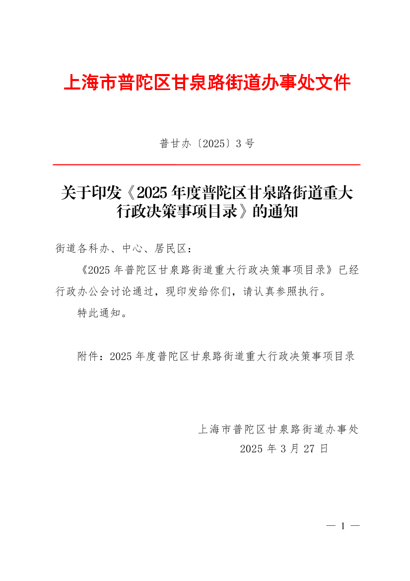 关于印发《2025年度普陀区甘泉路街道重大行政决策事项目录》的通知