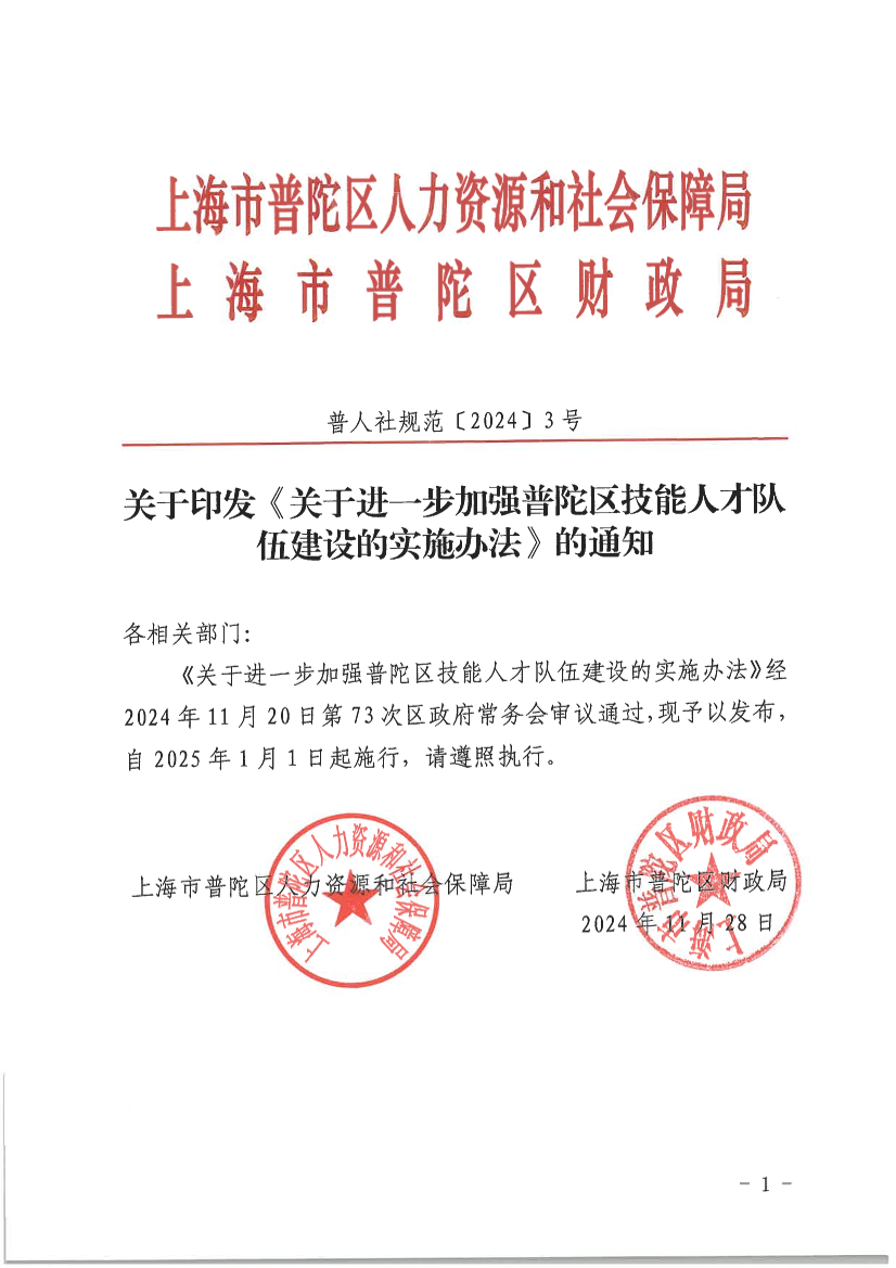 《关于进一步加强普陀区技能人才队伍建设的实施办法》经2024年11月20日第73次区政府常务会审议通过,现予以发布,自2025年1月1日起施行,请遵照执行。